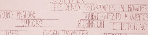 This is the kind of tension that is noted in the wall drawing, Crises on Infinite Earths, by Heman Chong and Rodney LaTourelle. Sketching with pencil directly on the wall, like laconic scribbles in a toilet, this aggravated map of snares, snags, and hazards presents a parallel narrative foil of art and video production. In this confessional context, the prosaic may transform into a celebratory testament.