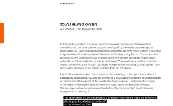 ____Art vis-á-vis: Meeting as Medium As part of the residency she engaged also in a dialogue with Lise Nelleman on topics like the institutional model of a space like Sparwasser HQ, the artistic media presented there as well as a selection of artist positions that Sparwasser HQ introduced to the public.