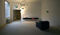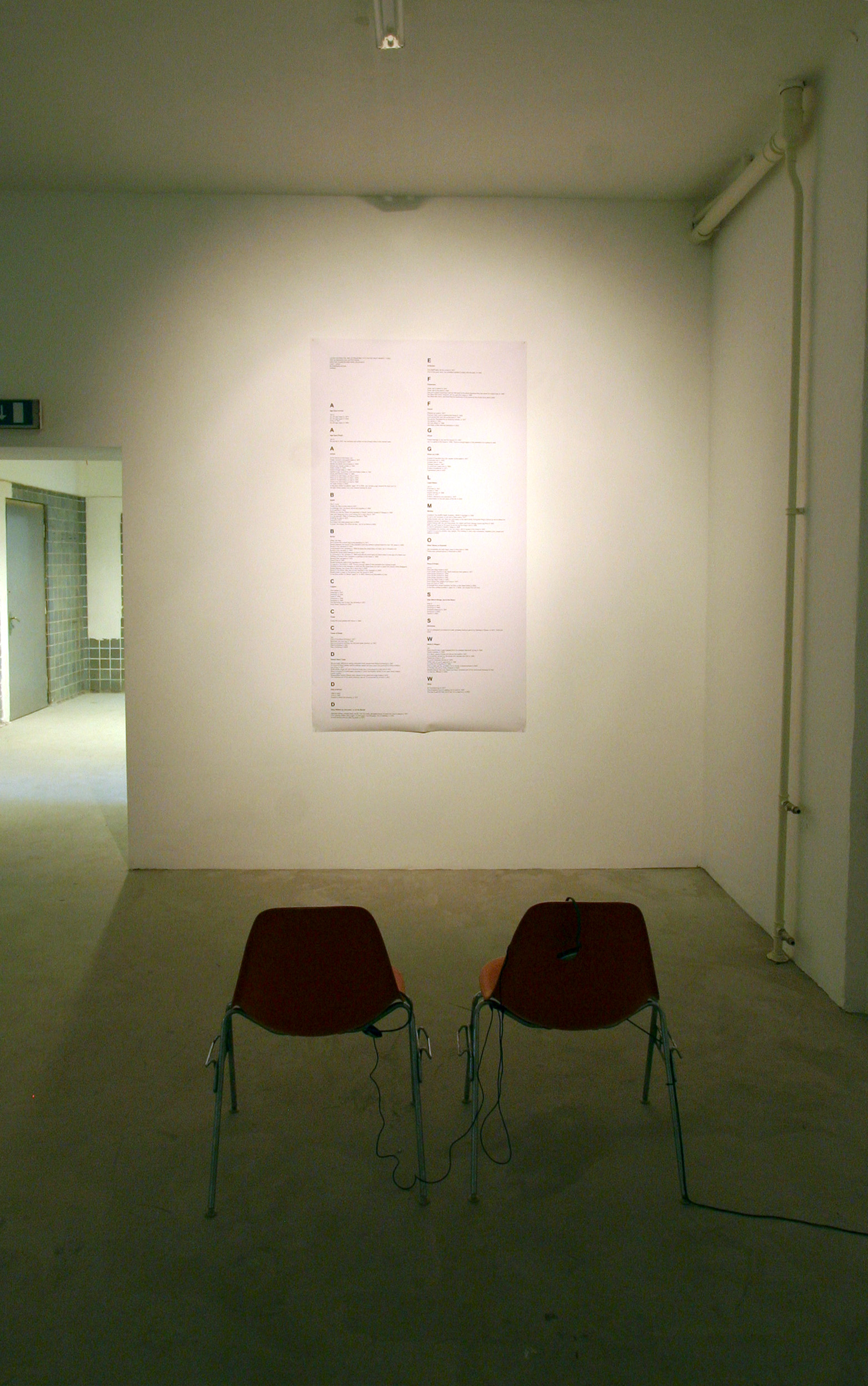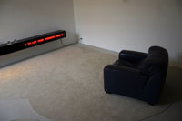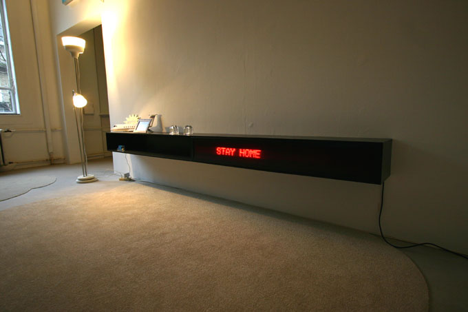 Tanja Nellemann Poulsen / Grete Aagaard: SET UP TOURS, digital running text, sofa chair, cut out carpet |