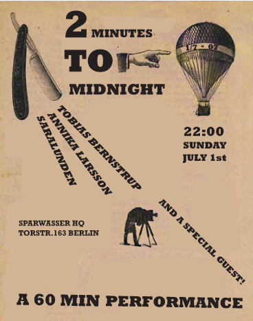 Sunday July. 1 at 10 p.m. 2 minutes to midnight performance by Tobias Bernstrup, Annika Larsson, Saralunden and special guest (a 60 minutes long performance)