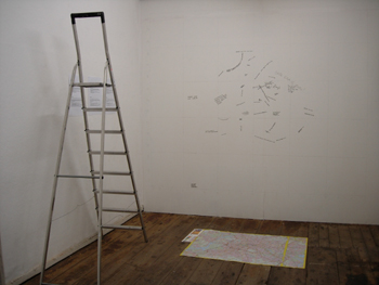 nachzudenken wie Worte In einem weiteren Raum, wurde Paul McDevitt eingeladen, zu bestimmten Zeiten den Ort für die Produktion kleiner Zeichnungen zu besetzen. Bilder produzieren als Event. Raum einnehmen ist hier eher als Sinnproduktion, denn als Raumfüllung zu verstehen. Die Zeichnungen, häufen sich mit dem Fortschreiten der Ausstellungsdauer, wie auch der wachsende Stadtplan im anderen Raum, zu einer sichtbaren Dokumentation der Ortsbesetzung. Aus dem Keller kann man Beech's