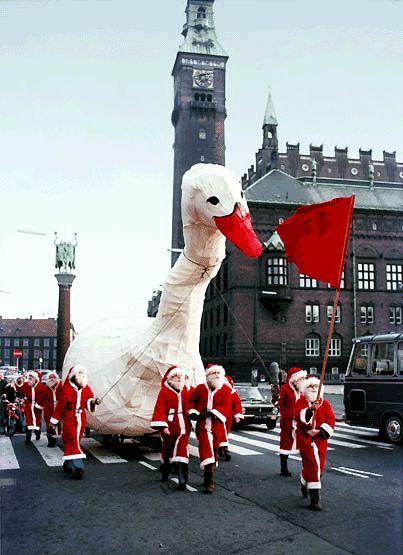 "DEJLIG ER DEN HIMMELBLÅ" The film is about a group and street theather Solvognen (network of approx 100 participants), that existed in Copenhagen/Christiania 1969-82. Characteristic it the activistic and polical tradition of theater groups from this period in Denmark. The film DEJLIG ER DEN HIMMELBLÅ is a documentary of Solvognens intervention in public space in 1974 with their "Santa Claus Army".The film is made by Jon Bang Carlsen. The "intervention" is to find between theatrical performance and political activist intervention in the public space or even a demonstation/parade. The theater group worked in other cases with a total scenery (total teater). Also in the case of the "Santa Claus Army" intervention, the audience, the preformers and , also real life (+ national traditions) around the performance fused into one event, there is no viewer, only particpants. |