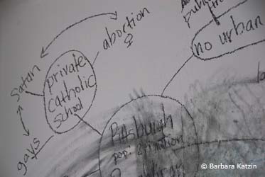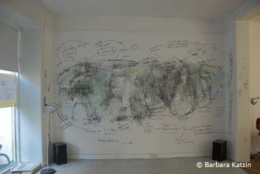 I find myself back in the rum46 office, anxiously necking another beer. I skim my notes and prepare to deliver my introductory talk in the gallery, announcing a structure for my time in Århus and the public offerings I have planned for the residency. This time I show my face and refer to a crude 'mind-map' sketched on the wall in black charcoal. The map depicts a rendering of the path I recall travelling on my journey from childhood in Pittsburgh, through my mid-20s professional life in New York City, and onward to my MFA studies and experience with the public social and cultural institutions of Scandinavia. Through an annotated personal narrative, I sought to illustrate the development of my understanding of notions of 'the public'—beginning with the very narrow and unprivileged position of the public sphere in US institutional orders (and the cultural identities engendered within this marginalization), through my experience of the more developed historical/cultural notions and institutions of 'the public' across the Scandinavian welfare states. After 8 years of a Venstre/Konservativ/DF coalition, the Danish political and cultural landscape seems a particularly contentious battleground between public and private interests, marked since the 80s by increasingly Americanized social, cultural, and economic ideologies, as well as by discussions of the crisis of the welfare state and Danish national identity.